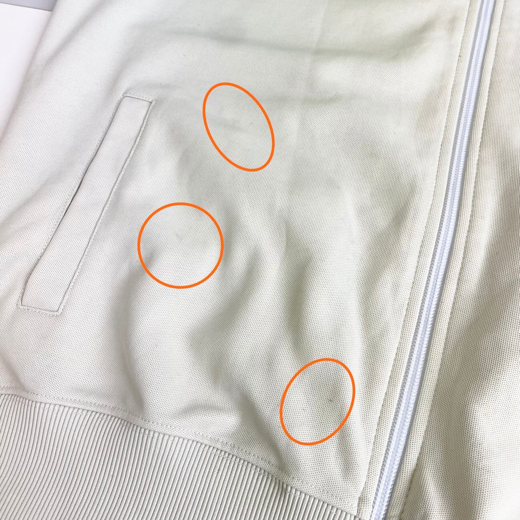 正面左側、数か所に小さなシミ、左袖にインクのような汚れがございます。(画像8-10枚目参照)